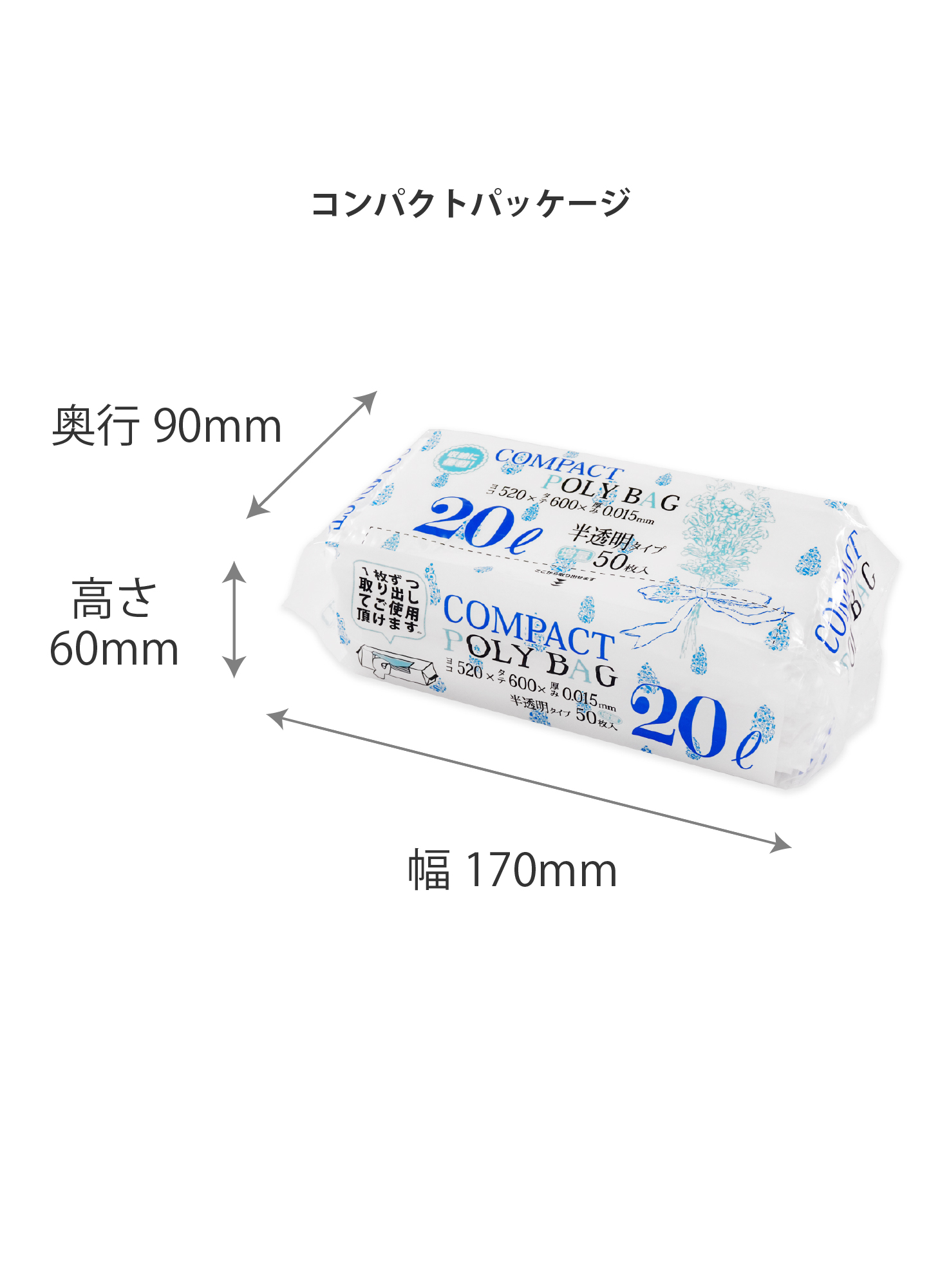 20リットルの半透明の袋です。コンパクトでテッシュペーパーのように取り出しやすい為、どこでも便利に使用できます。パッケージサイズ幅17X奥行9X高さ6㎝