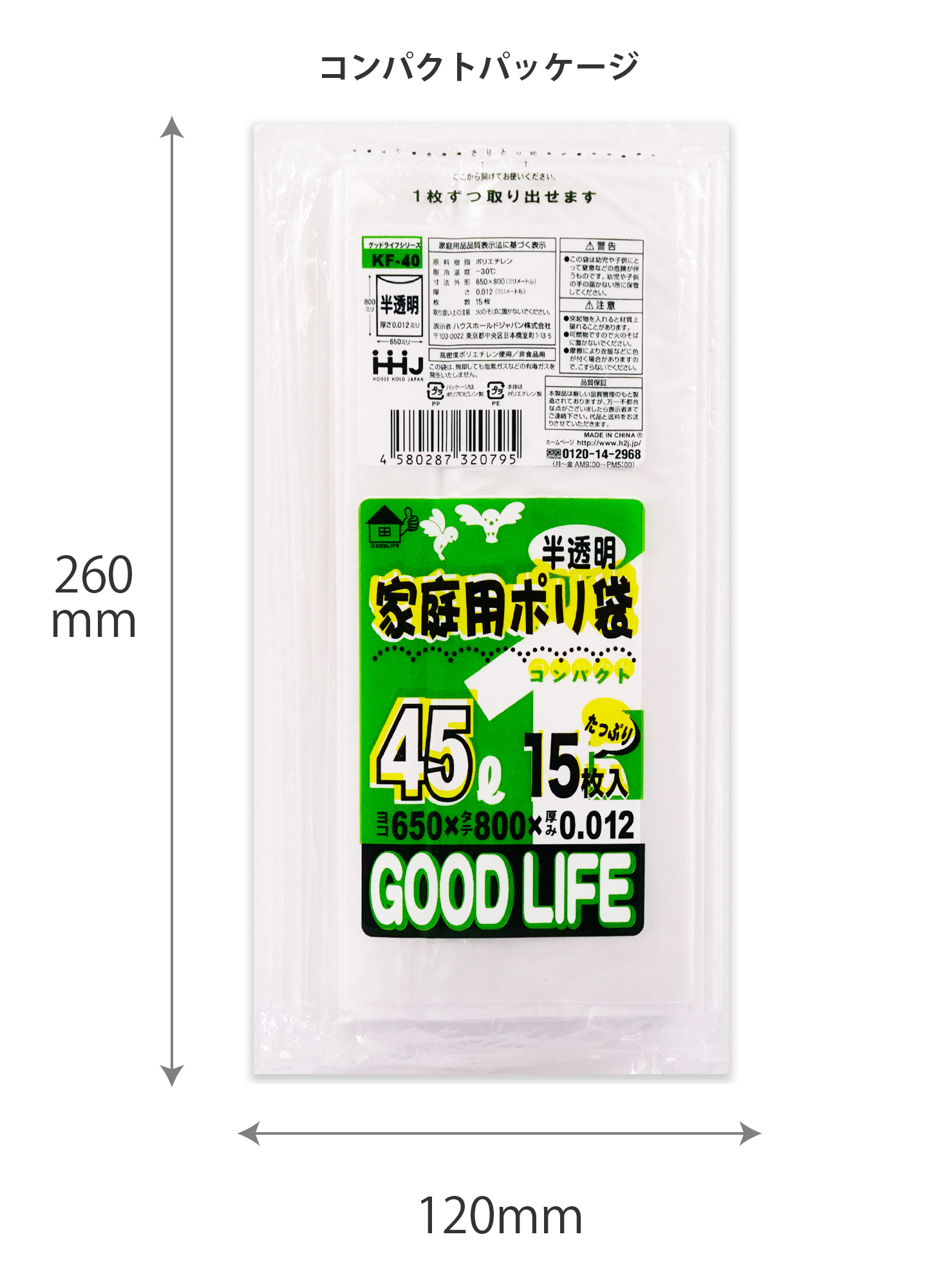 45リットルの半透明の袋です。コンパクトパッケージで見た目スッキリ。