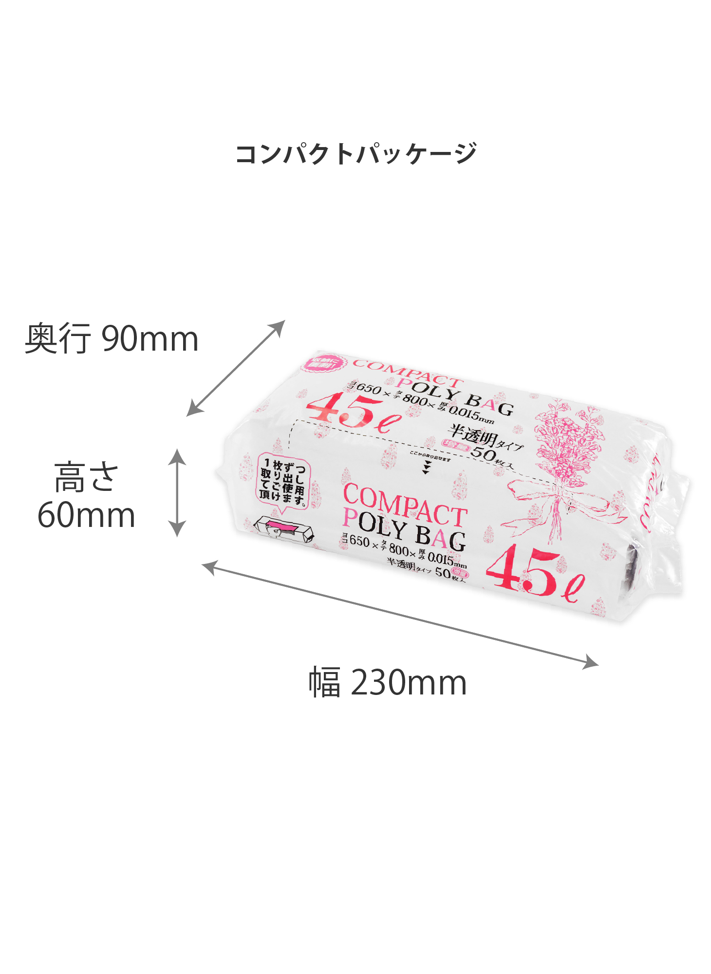 45リットルの半透明の袋です。コンパクトでテッシュペーパーのように取り出しやすい為、どこでも便利に使用できます。パッケージサイズ幅23X奥行9X高さ6㎝