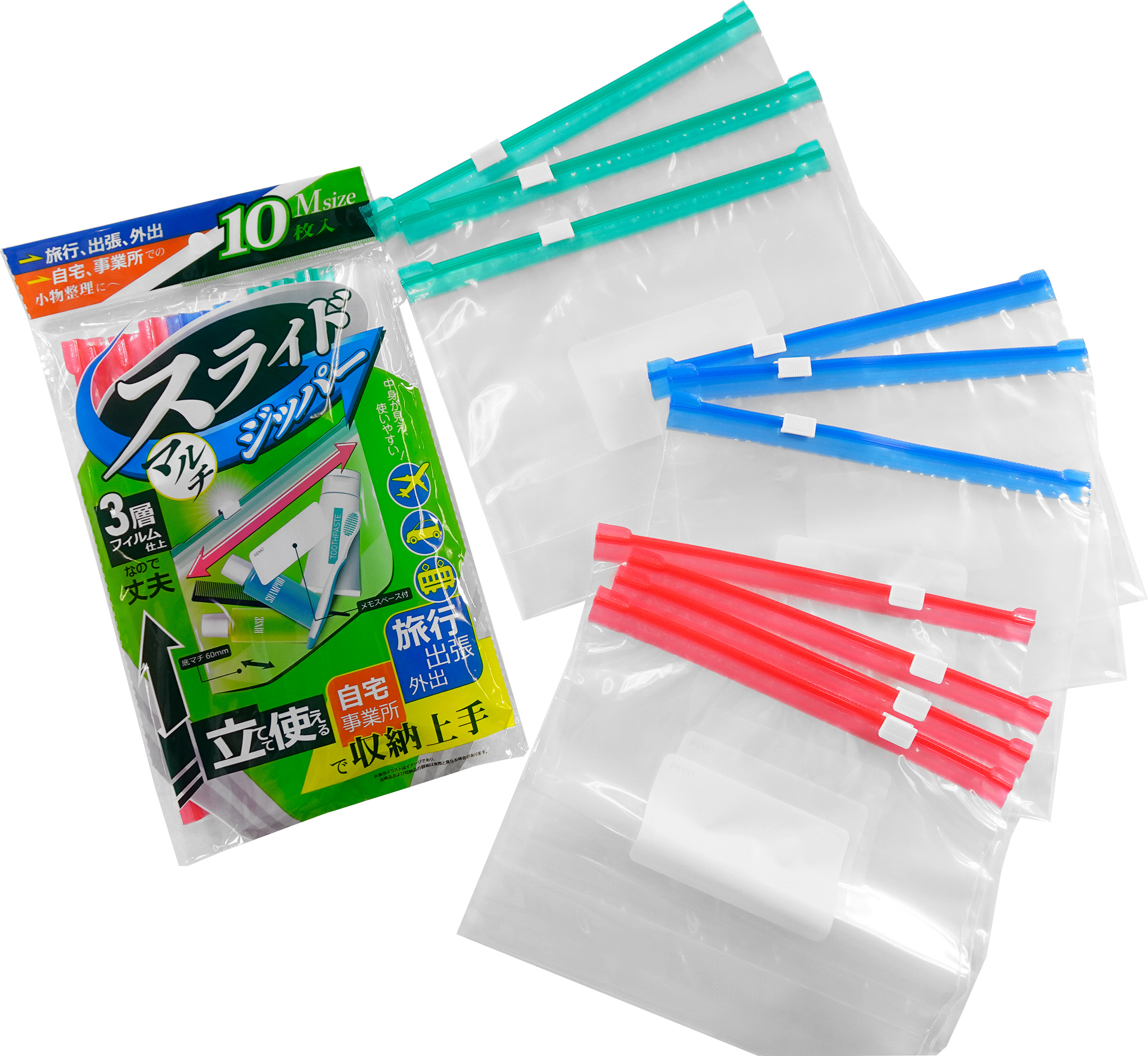 底マチのあるスライドジッパーMサイズです。紙幣を折らずに入れることができるサイズです。カラーバリュエーションは赤、青、緑の3色入りです。