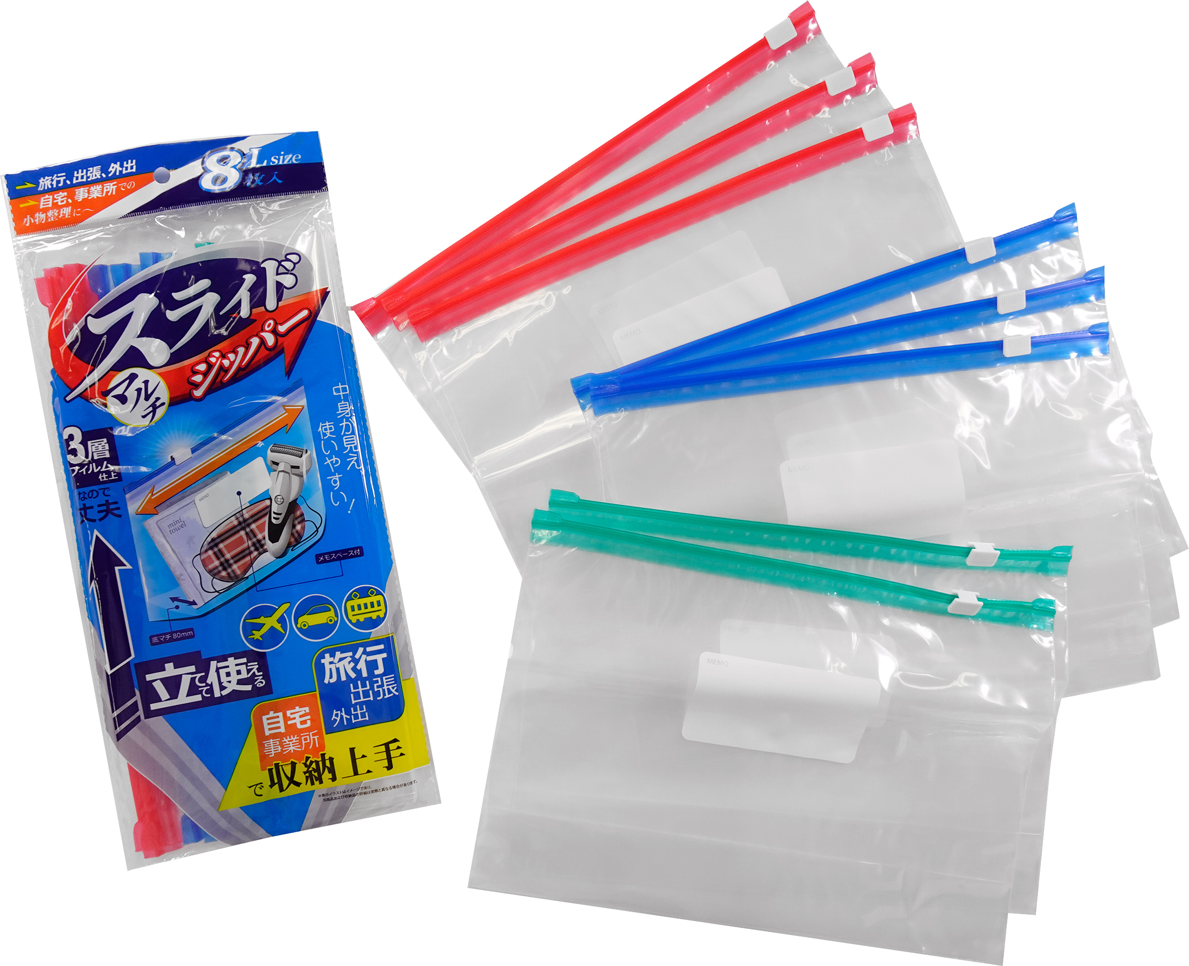 底マチのあるスライドジッパーLサイズです。大容量で歯ブラシも持ち運びケースごと収納できます。カラーバリュエーションは赤、青、緑の3色入りです。