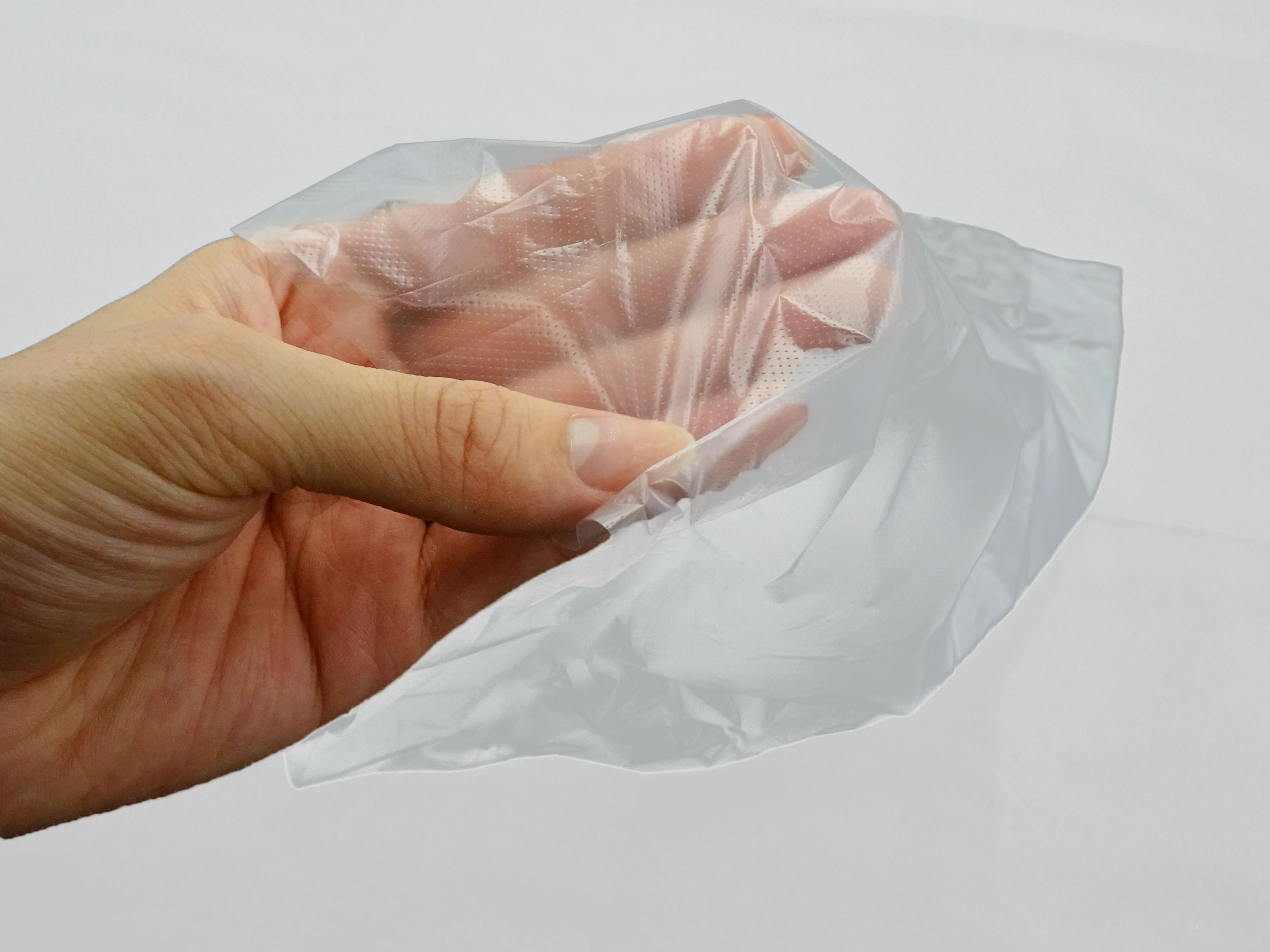 エンボス加工入りで滑りにくく、取り出しやすいマチ付き(片側30ミリずつ)ポリ袋です。