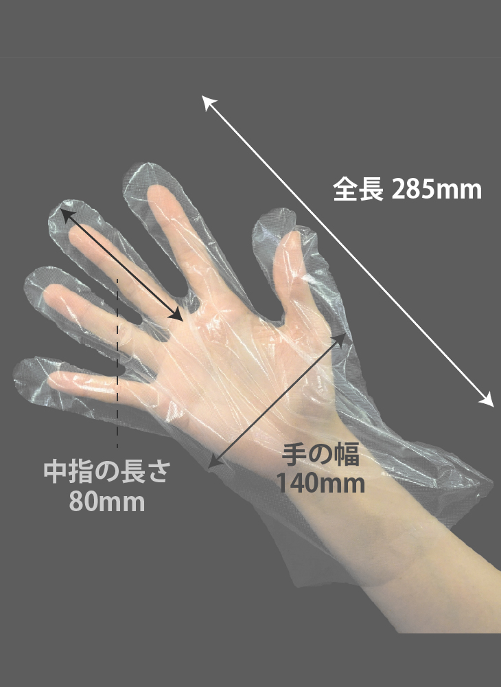 CPEを使用した使いきり手袋のLサイズです。外側にエンボス加工が施されています。LLDPEと比べて透明度は落ちますがサラっとした感触でスムーズに着用でき、長時間つけても汗でべとつきにくい手袋になります。左右兼用で1箱100枚入、全て両手で使用した場合は50組分になります。食品衛生法適合品で、調理や衛生対策、毛染めなど幅広く使用できます。