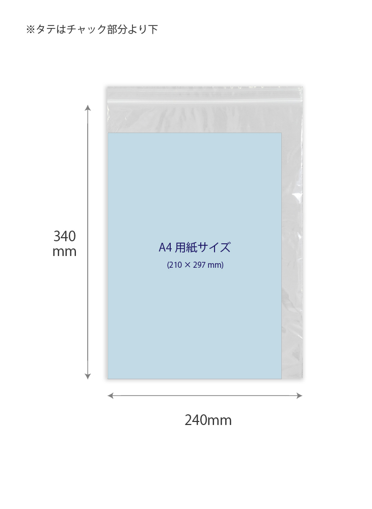 透明無地のチャック袋です。A4サイズの用紙が折らずに入るサイズです。