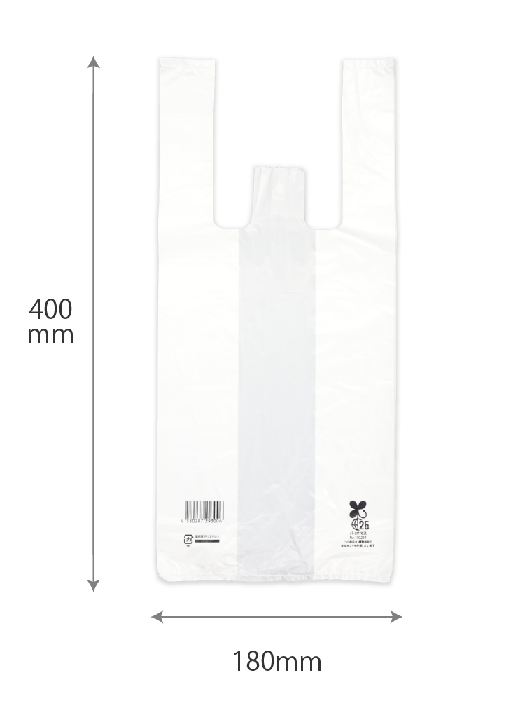 レジ袋(東日本12号/西日本30号)バイオマスプラスチックを25%使用し、無料配布対象になるレジ袋です。レジ袋本体にJANコード・プラマーク・バイオマスマークが印刷されています。※吊り下げて使用でき、1枚ずつちぎって使えます。
