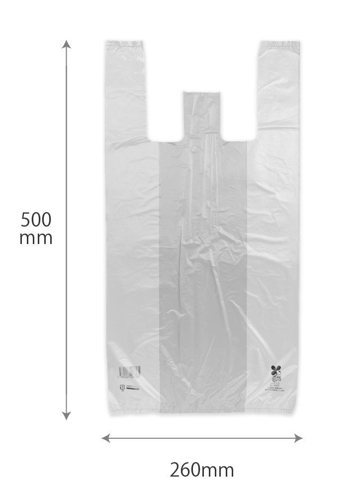 レジ袋(東日本30号/西日本40号)バイオマスプラスチックを25%使用し、無料配布対象になる半透明レジ袋です。レジ袋本体にJANコード・プラマーク・バイオマスマークが印刷されています※吊り下げて使用でき、1枚ずつちぎって使えます。