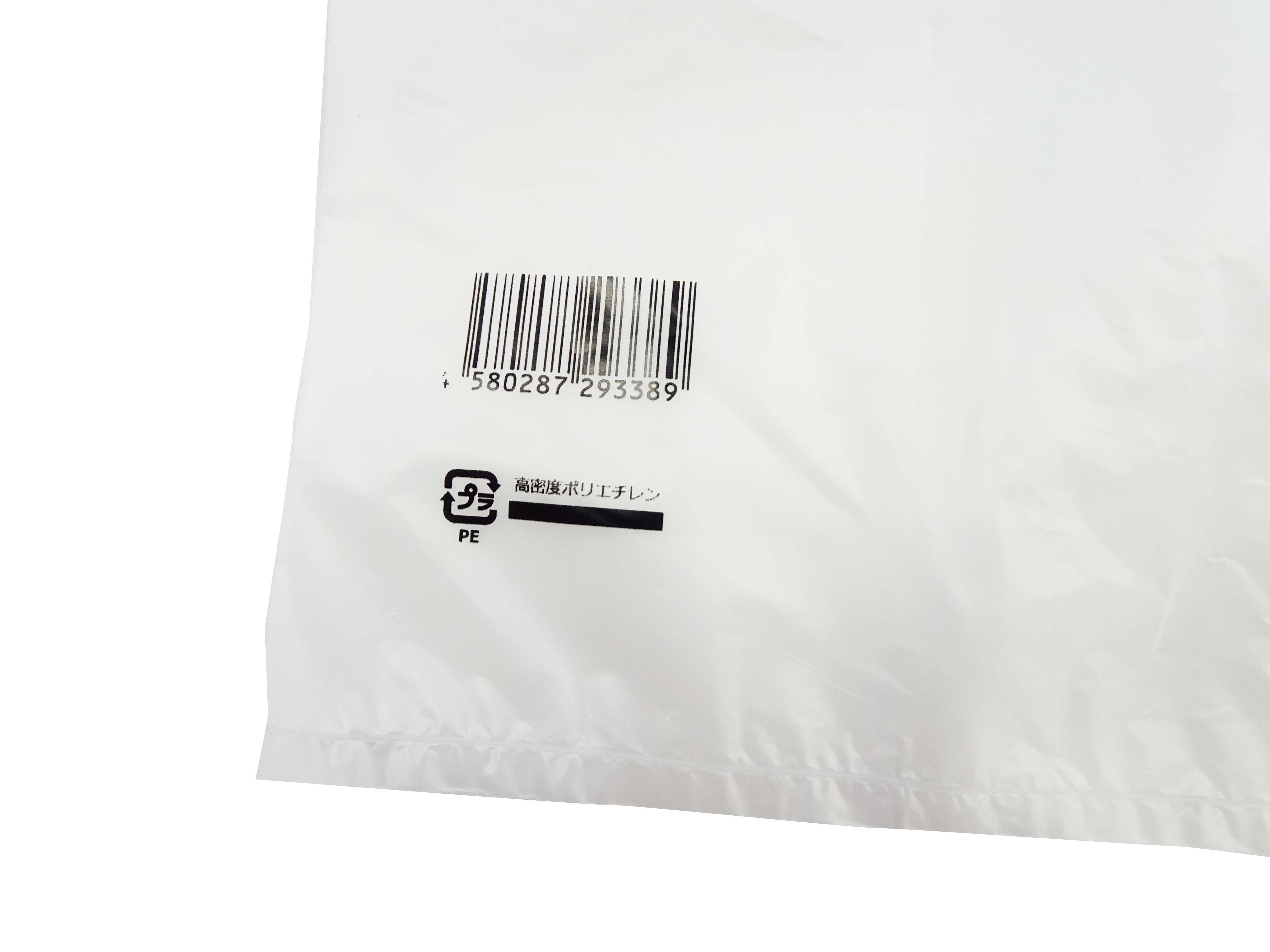 レジ袋(東日本60号/西日本50号)バイオマスプラスチックを25%使用し、無料配布対象になる半透明レジ袋です。レジ袋本体にJANコード・プラマーク・バイオマスマークが印刷されています。※吊り下げて使用でき、1枚ずつちぎって使えます。